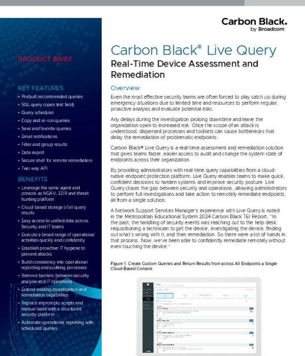 Time-consuming investigations and bottlenecks delay response to cyber threats, leaving your organization vulnerable. This solution brief on Carbon Black Live Query details how this real-time assessment and remediation solution enables security and IT teams to quickly investigate endpoints, audit system states, and execute remediation from a single platform. Download the brief to see how Live Query empowers teams to make quick, confident decisions and remove barriers between security and IT operations. Contact The Great Solution to discuss how Live Query can enhance your team’s efficiency and protect your environment.